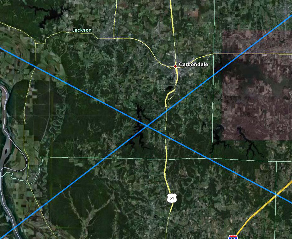 Y, por supuesto, muchos cazadores de eclipses querían ir a ese lugar, para poder decir que habían visto dos eclipses desde el mismo lugar. En realidad, esto no es algo muy difícil de hacer en el curso de la vida de uno, pero los puntos de intersección de los trayectos de eclipses generalmente se encuentran en lugares lejanos y alejados, ¡si no es que en medio del océano! (Los eclipses totales de 2006 y 1999 fueron visibles desde una ubicación en el centro de Turquía, por ejemplo). Este punto de intersección se encuentra en un lugar remoto llamado... el sur de Illinois.