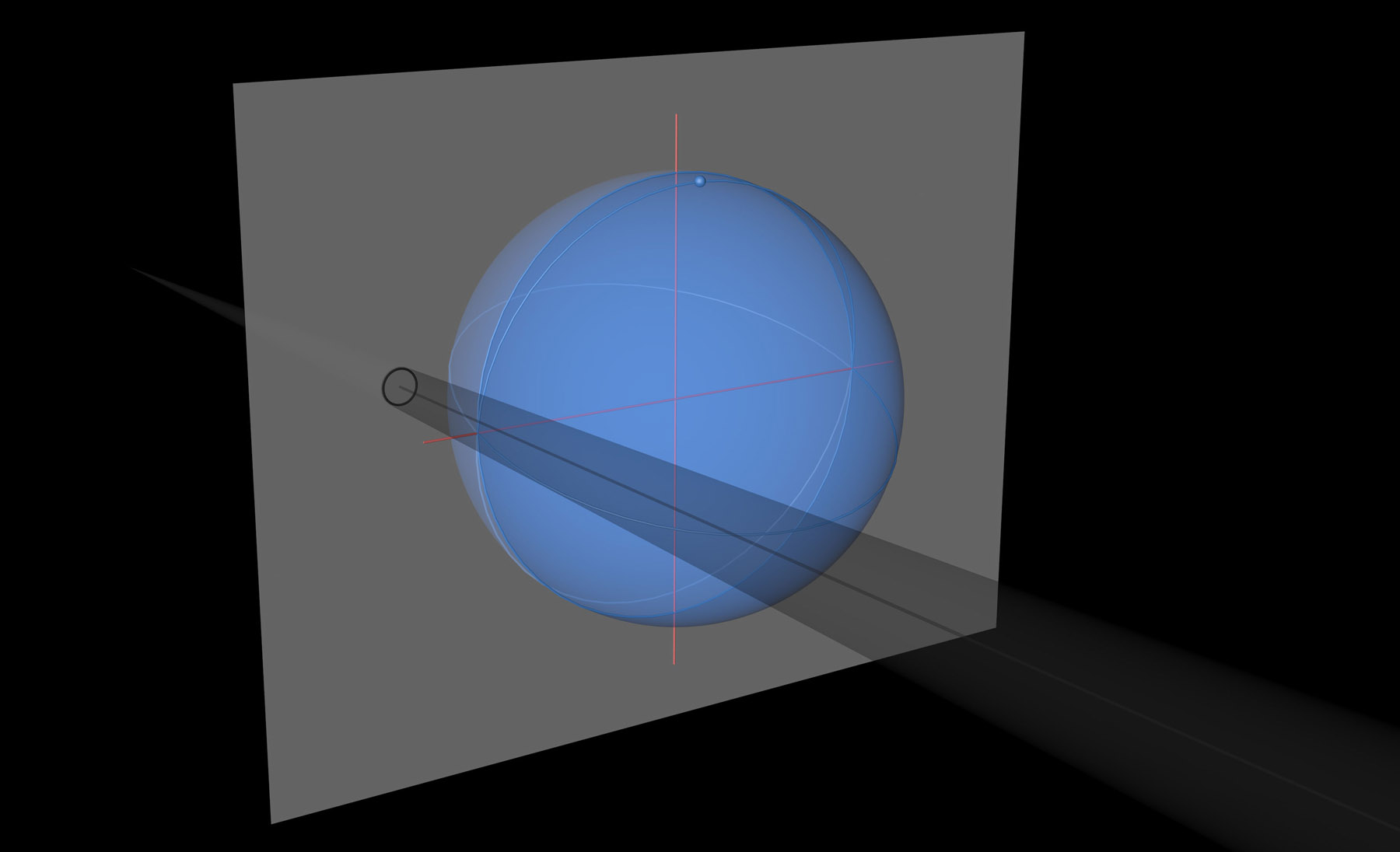 (Note to purists: The lunar shadow outline on the fundamental plane will not be a perfect circle, because the Moon itself is not an exactly perfect sphere. However, it is so close that we lose practically nothing at all by making that assumption. And if we want to introduce that level of accuracy into the calculations, we can do so with math that is only slightly more complicated. We just use an ellipse [